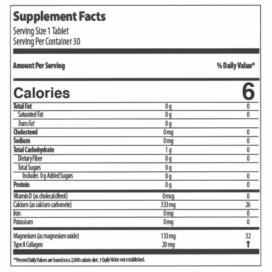 Nutriplus Calcium Magnesium Plus is a unique combination of Calcium, Magnesium, and Type II Collagen formulated to support bone health. Contains 333 mg of Calcium—essential for building and maintaining strong, healthy bones—and 133 mg of Magnesium to enhance calcium absorption. Calcium supports the musculoskeletal and nervous systems, helps maintain weight, supports heart health, and balances blood pH levels. Magnesium aids in muscle and nerve function, energy production, and calcium transport while supporting bone formation and protein synthesis. Collagen assists in bone calcium association and the regeneration of cartilage, tendons, and bones. Using these nutrients together improves overall absorption and effectiveness. Gluten-free, caffeine-free, and free of preservatives and added sugar.