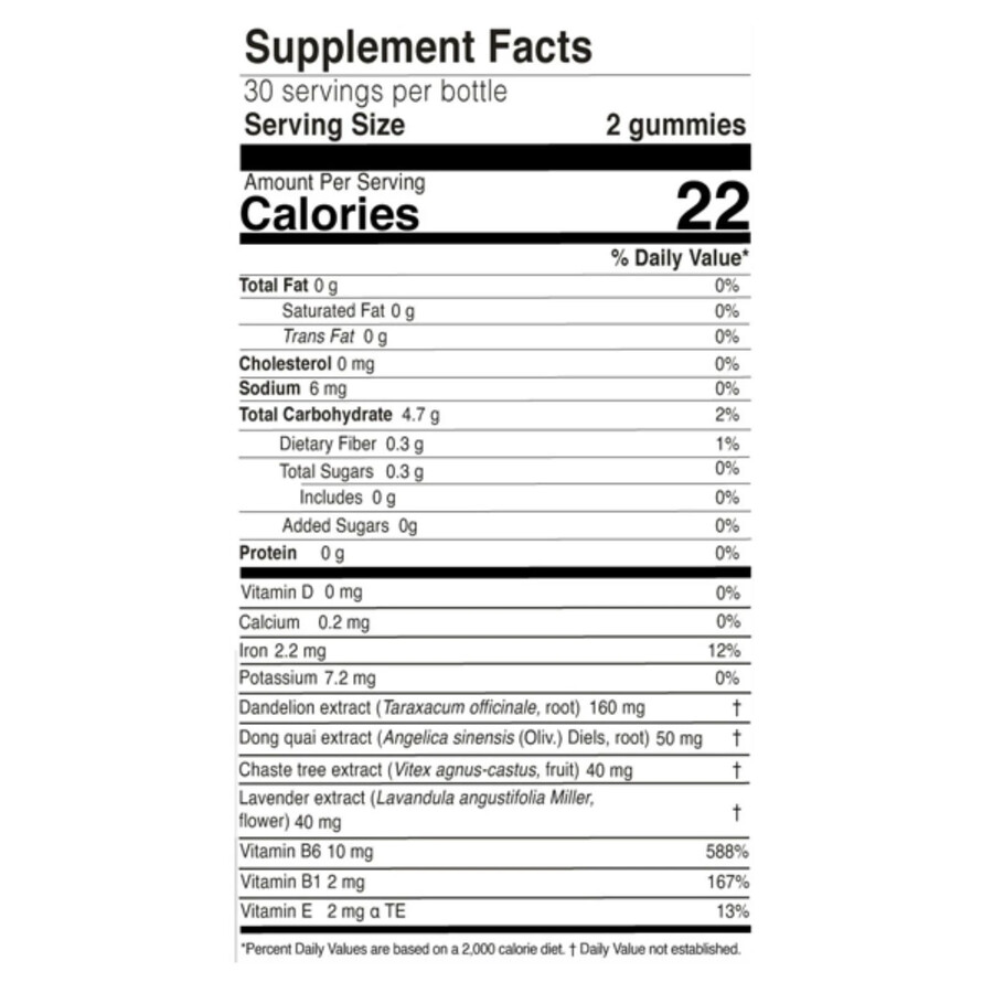 Featuring a botanical blend of Dong Quai Extract, Chasteberry Extract, and Dandelion Extract, these gummies are scientifically formulated to ease menstrual symptoms. Embracing botanical ingredients trusted by women for generations, these gummies offer a modern solution rooted in centuries of tradition. Two Cyclical Relief Gummies contain: 2.2 mg of Iron, 7.2 mg of Potassium, 160 mg of Dandelion Extract, 50 mg of Dong Quai Extract, 40 mg of Chaste Tree Extract, 40 mg of Lavender Extract, and 10 mg of Vitamin B6. Helps relieve menstrual cramping and bloating, reduces mood swings and irritability, and promotes a sense of calm.